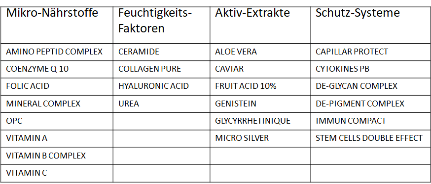 - 4 erprobte Feuchtigkeitsfaktoren decken den hohen Bedarf an faltenglättenden Substanzen ab.